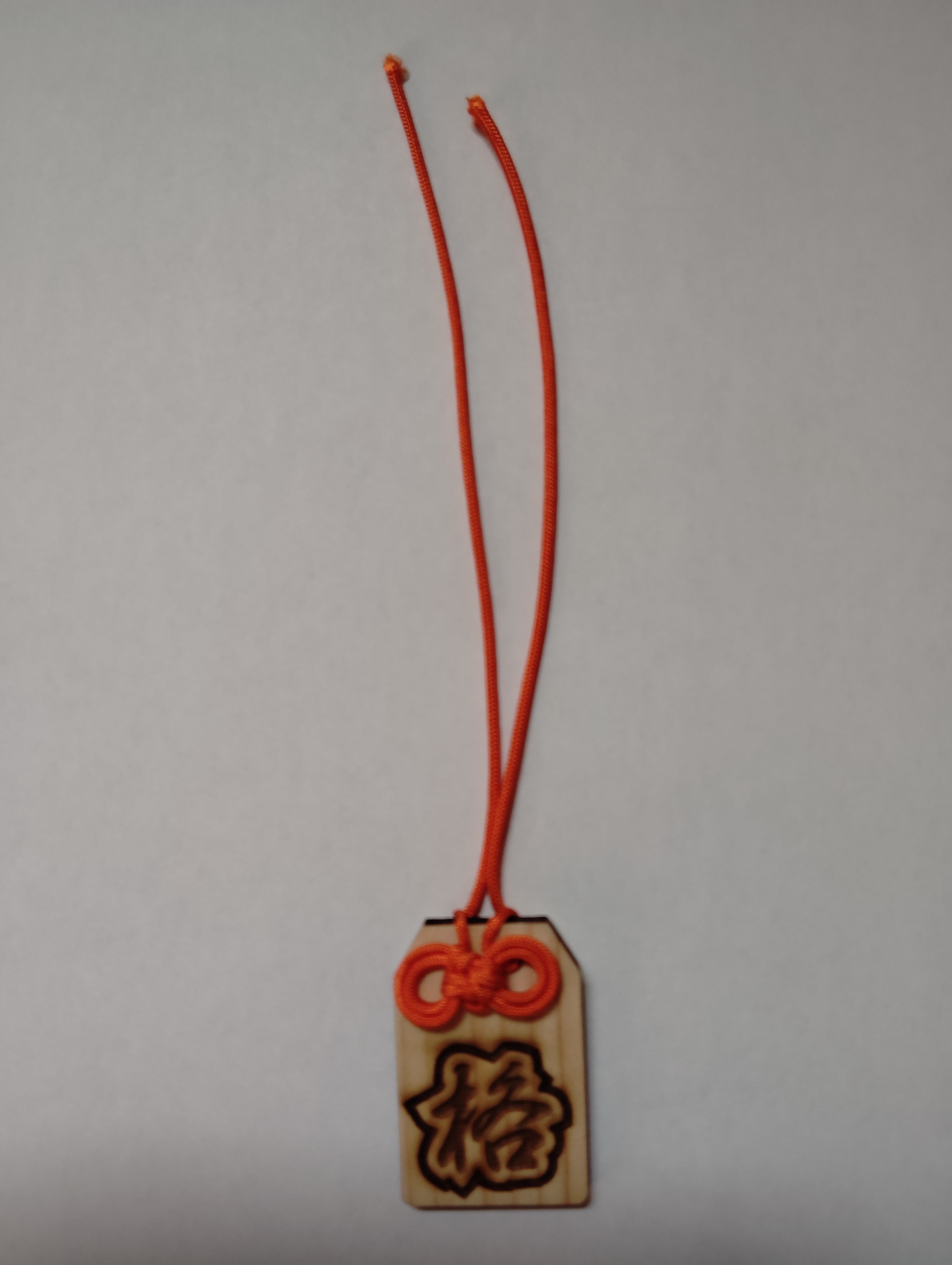 材質:国産ひのき木材、寸法:30㎜×45㎜ 4㎜厚、色は木材素地、格という文字とその周りは、彫りこみでこげ茶色(多少の濃淡があります)。結び紐(橙色)付き、余分長さ約140㎜