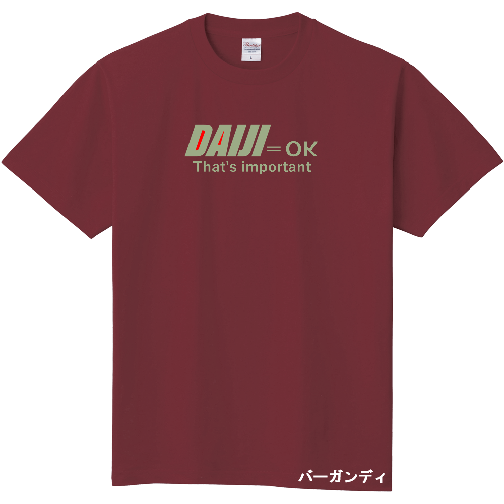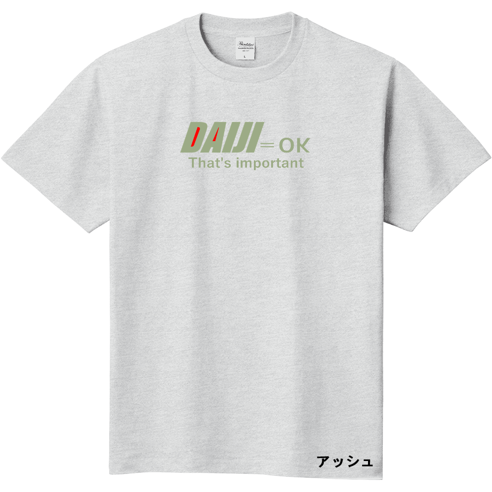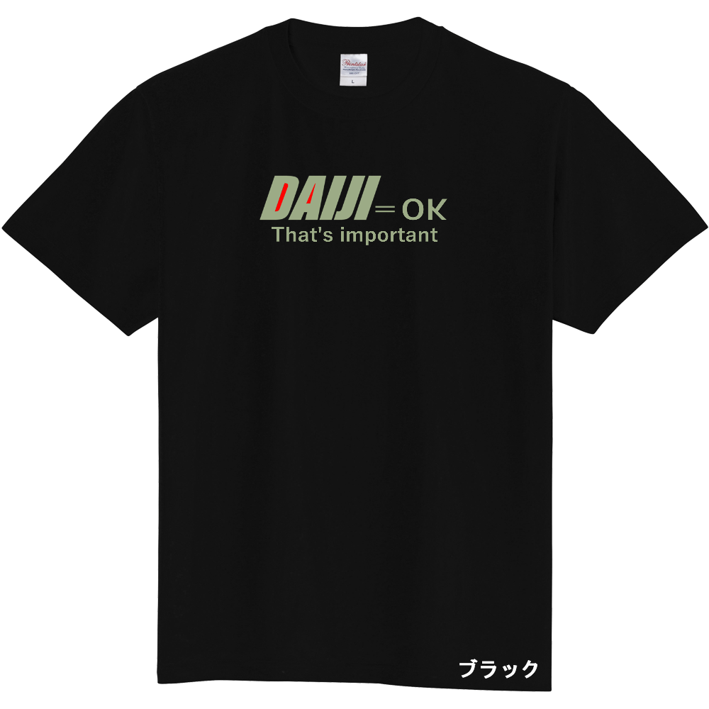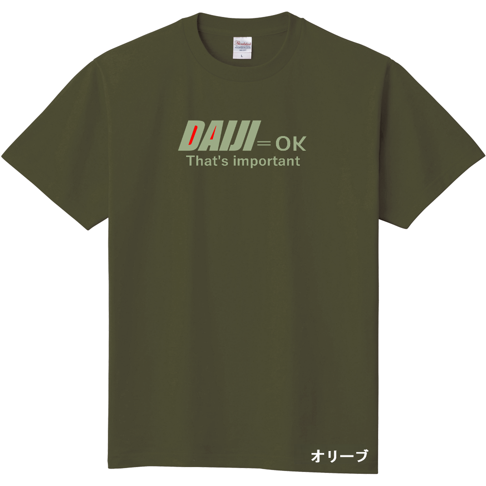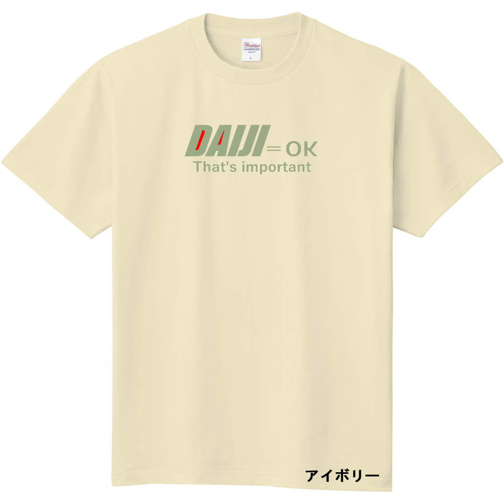 ■ 文字の意味:「だいじって思うことは大事」(最初のだいじは大丈夫の栃木弁:大丈夫と思う事は大事=自信もってやればできるという意味)というオリジナルワードを英語風にデザイン。DAIJI=Okの意味は、DAIJI:だいじ=大丈夫って思えばいいんだよ、自信を持てばいいんだよということ。That’s important:それが重要。「自信もってやるのが重要」=「自信もってやればできる」文字色はやわらかい感じのセージグリーン。DAの内側を赤にしたのは、栃木はイチゴが有名なのでイチゴの赤。他とは違うというユニークな個性を、このTシャツで表現してみませんか!?